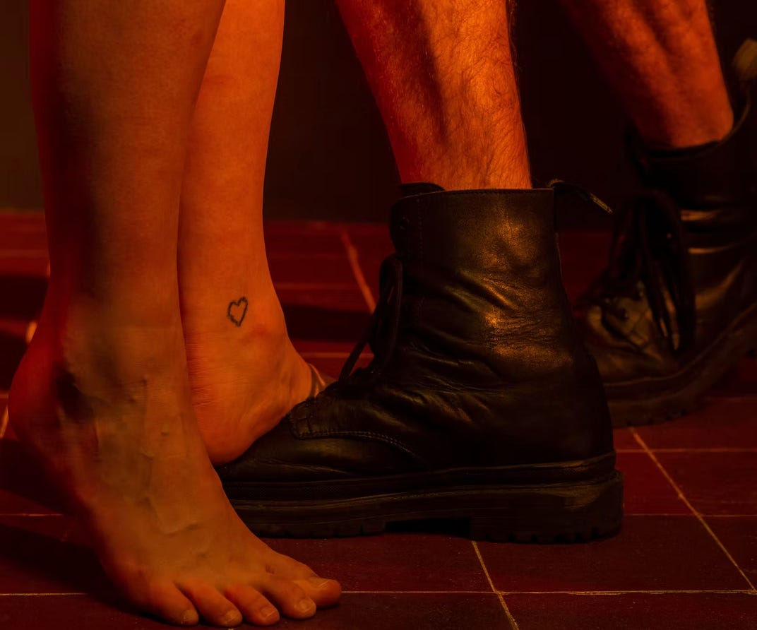 I catch a cab home — work’s paying — and by the time I make it home my whole body is burning up. You hear the key in the door and meet me there, a glint in your eye. It’s been a week. You push me into the bedroom and onto the bed. I’m trapped as you straddle me. I wrestle my way on top and pin you down. You’re laughing as you fight back — threaten to knee me in the balls. We take turns to tear each other’s clothes off.